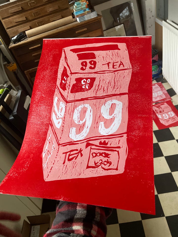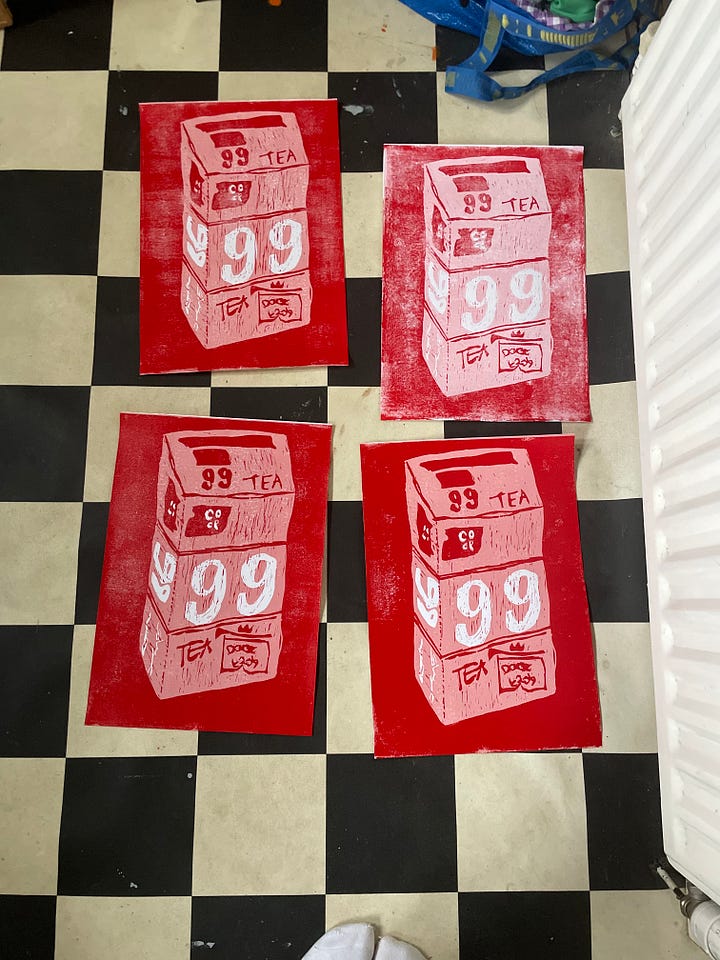 So following on from last time we had a Sunday buffet together, Pie has finished making her lino cut. Isn’t it brilliant?