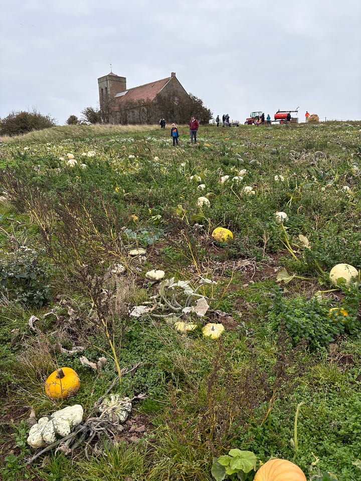 🎃 I will plonk the pumpkins we picked at the patch onto the mantle piece. 🍰 Pie made a cake last night, we will scoff that. 🍽️ Gerry is promising a roast dinner and I have a lino print to finish. Should be a good Sunday!