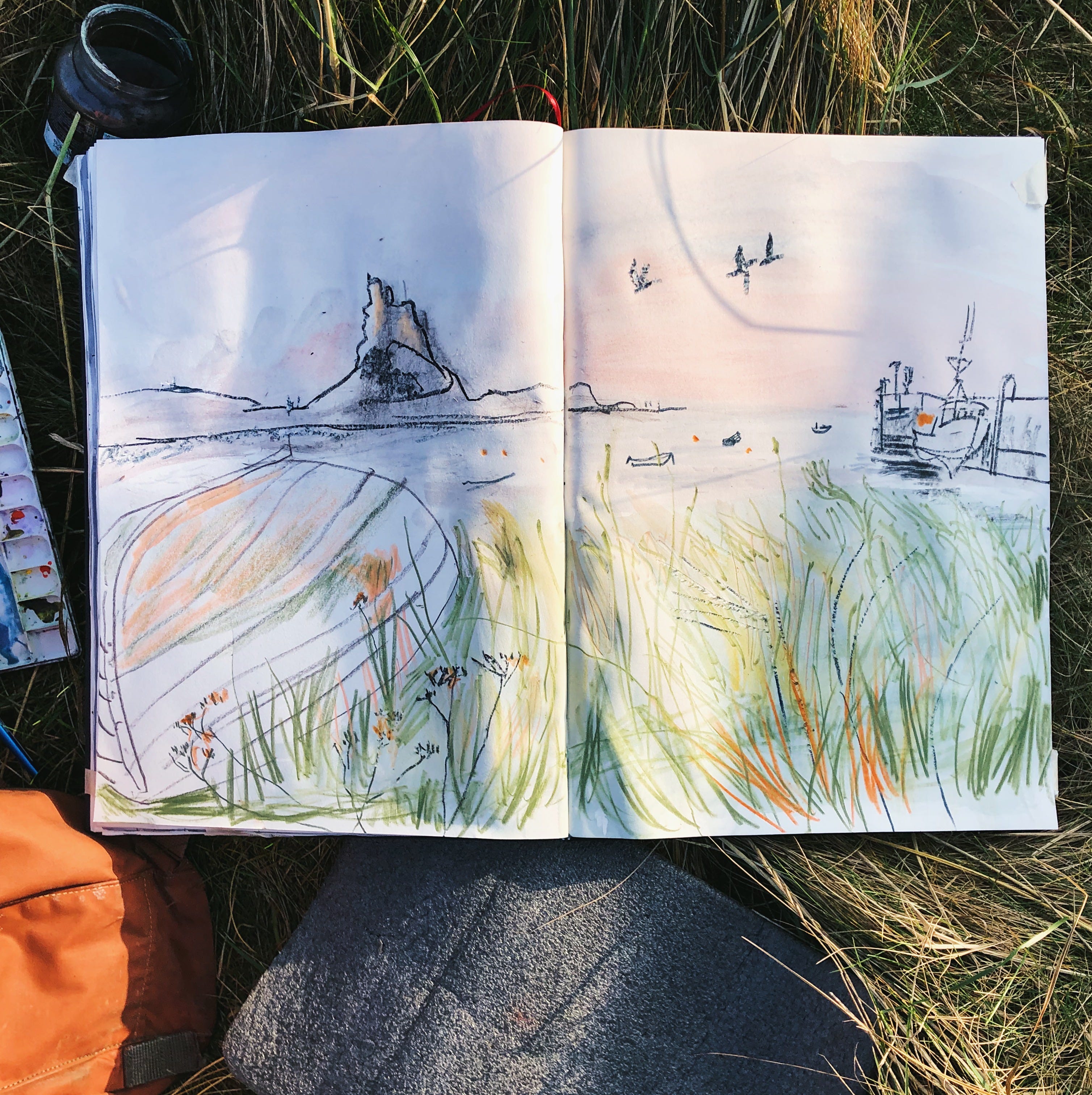 I did this sketch of Holy Island in a Seawhite Brighton A3 sketchbook that opens out to A2.